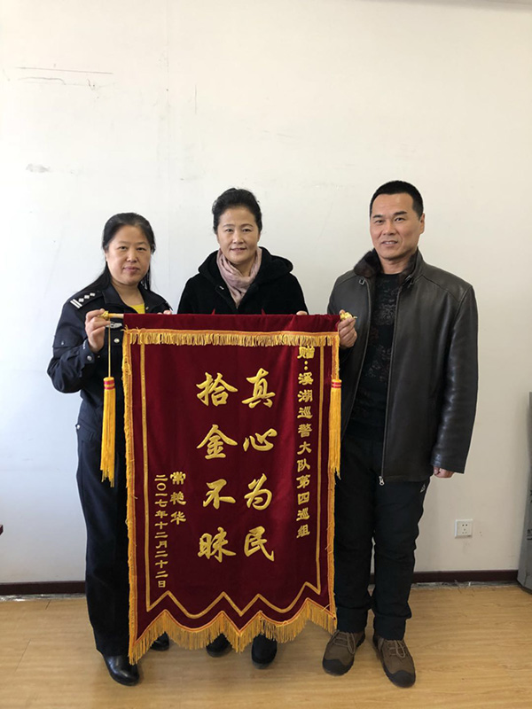 12月27日,常女士将一面写有“拾金不昧,真心为民”的锦旗送到民警手里,表示感谢。
